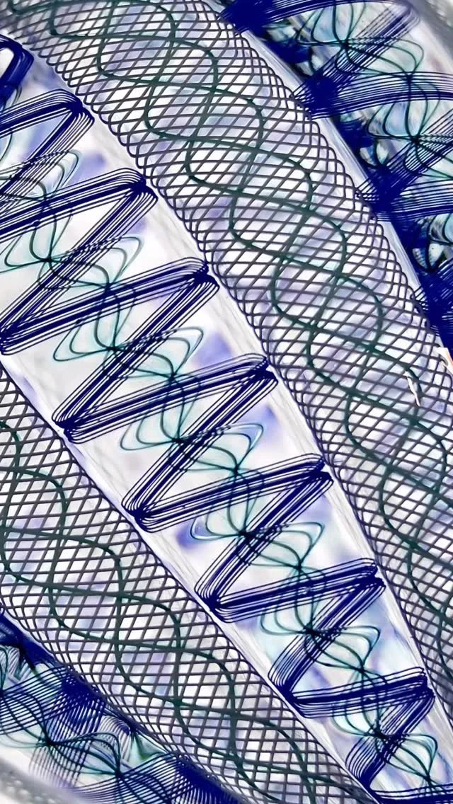 Blow the second bubble into the first cup. The opposing directions of the twist make the pattern, the ribbed texture traps an air bubble at every intersection.